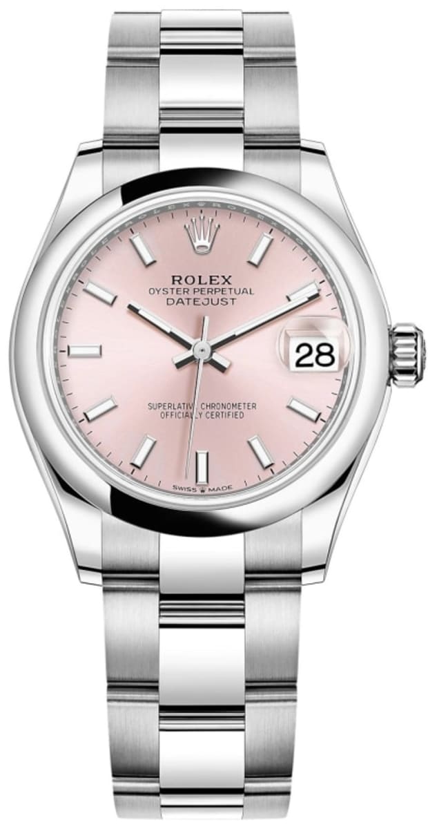 Brand New Rolex Datejust 31 Stainless Steel Pink Dial Women’s Luxury Watch Model M278240-0007. Polished Stainless Steel. case with Stainless Steel Oyster Style Bracelet. watch band. Crownclasp clasp. Fixed-Domed bezel. Dial description: Polished Silver Hands and Stick Hour Markers and the Date Displayed on a Pink Dial. dial. Automatic – Chronometer movement. Powered by Rolex Calibre 2236 engine with 55 hours power reserve. Watch functions: Date, Power Reserve, Hour, Minute, Second. Screw in crown. Scratch Resistant Sapphire crystal. Round case shape. Case size: 31mm. Solid case back. 100 Meters – 330 Feet water resistant.