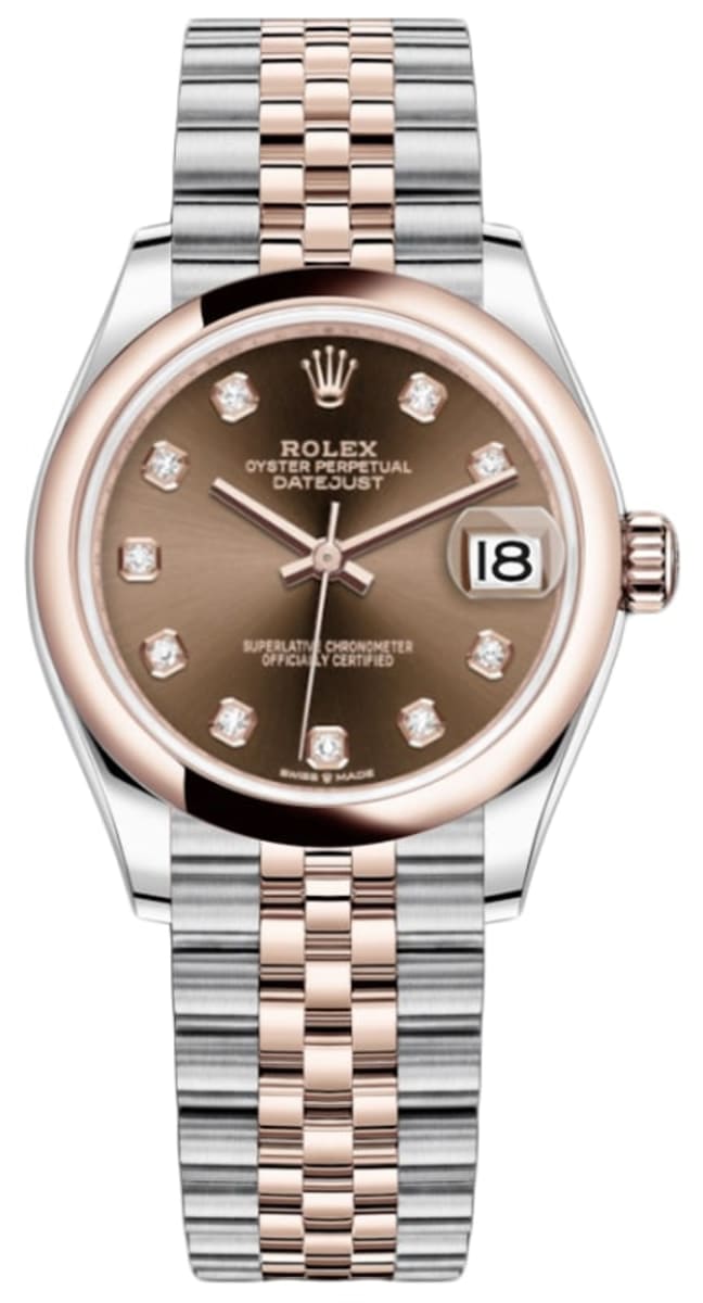 Brand New Rolex Datejust 31 Steel and 18kt Everose Gold Chocolate Diamond Dial Women’s Luxury Watch Model M278241-0028. Polished 18kt Everose Gold and Stainless Steel. case with 18kt Everose Gold and Stainless Steel Jubilee Style Bracelet. watch band. Crownclasp clasp. Fixed-Domed bezel. Dial description: Polished Rose Gold Hands With Diamond Hour Markers and the Date Displayed on a Chocolate Dial. dial. Automatic – Chronometer movement. Powered by Rolex Calibre 2236 engine with 55 hours power reserve. Watch functions: Date, Power Reserve, Hour, Minute, Second. Screw in crown. Scratch Resistant Sapphire crystal. Round case shape. Case size: 31mm. Solid case back. 100 Meters – 330 Feet water resistant.