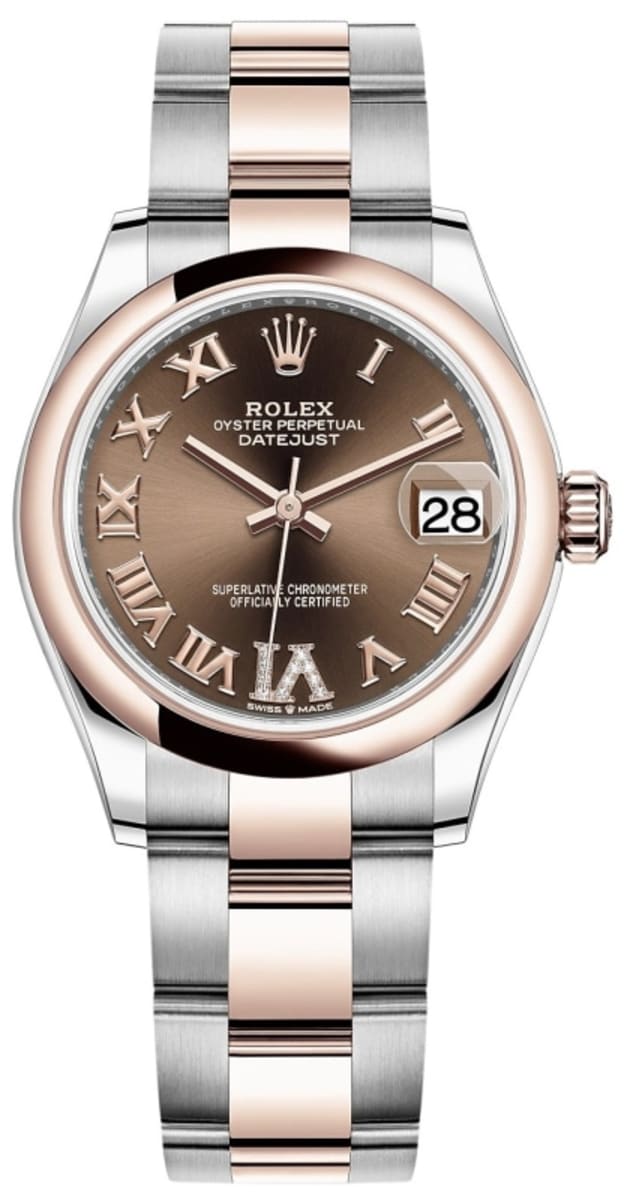 Brand New Rolex Datejust 31 Steel and 18kt Everose Gold Chocolate Pave Roman Dial Women’s Luxury Watch Model M278241-0003. Polished 18kt Everose Gold and Stainless Steel. case with 18kt Everose Gold and Stainless Steel Oyster Style Bracelet. watch band. Crownclasp clasp. Fixed-Domed bezel. Dial description: Polished Rose Gold Hands With Roman Numeral Hour Markers and a Pave Diamond at the VI hour marker and the Date Displayed on a Chocolate Dial. dial. Automatic – Chronometer movement. Powered by Rolex Calibre 2236 engine with 55 hours power reserve. Watch functions: Date, Power Reserve, Hour, Minute, Second. Screw in crown. Scratch Resistant Sapphire crystal. Round case shape. Case size: 31mm. Solid case back. 100 Meters – 330 Feet water resistant.