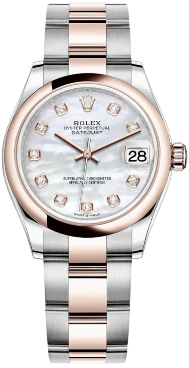 Brand New Rolex Datejust 31 Steel and 18kt Everose Gold Mother-of-Pearl Diamond Dial Women’s Luxury Watch Model M278241-0025. Polished 18kt Everose Gold and Stainless Steel. case with 18kt Everose Gold and Stainless Steel Oyster Style Bracelet. watch band. Crownclasp clasp. Fixed-Domed bezel. Dial description: Polished Rose Gold Hands With Diamond Hour Markers and the Date Displayed on a Mother-of-Pearl Dial. dial. Automatic – Chronometer movement. Powered by Rolex Calibre 2236 engine with 55 hours power reserve. Watch functions: Date, Power Reserve, Hour, Minute, Second. Screw in crown. Scratch Resistant Sapphire crystal. Round case shape. Case size: 31mm. Solid case back. 100 Meters – 330 Feet water resistant.