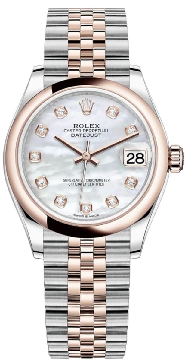 Brand New Rolex Datejust 31 Steel and 18kt Everose Gold Mother-of-Pearl Diamond Dial Women’s Luxury Watch Model M278241-0026. Polished 18kt Everose Gold and Stainless Steel. case with 18kt Everose Gold and Stainless Steel Jubilee Style Bracelet. watch band. Crownclasp clasp. Fixed-Domed bezel. Dial description: Polished Rose Gold Hands With Diamond Hour Markers and the Date Displayed on a Mother-of-Pearl Dial. dial. Automatic – Chronometer movement. Powered by Rolex Calibre 2236 engine with 55 hours power reserve. Watch functions: Date, Power Reserve, Hour, Minute, Second. Screw in crown. Scratch Resistant Sapphire crystal. Round case shape. Case size: 31mm. Solid case back. 100 Meters – 330 Feet water resistant.
