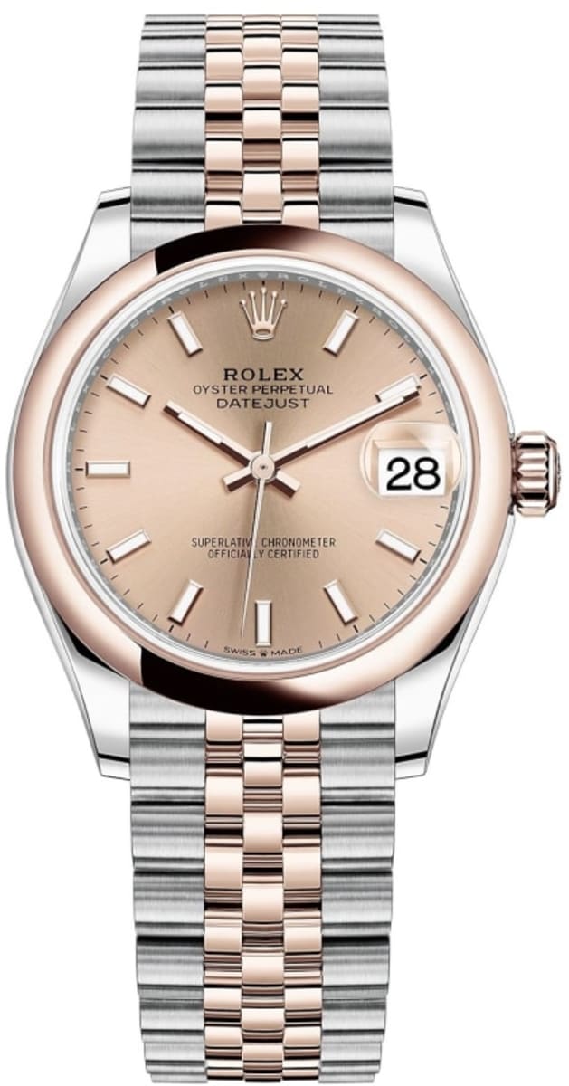 Brand New Rolex Datejust 31 Steel and 18kt Everose Gold Rose Dial Women’s Luxury Watch Model M278241-0010. Polished 18kt Everose Gold and Stainless Steel. case with 18kt Everose Gold and Stainless Steel Jubilee Style Bracelet. watch band. Crownclasp clasp. Fixed-Domed bezel. Dial description: Polished Rose Gold Hands With 10 Diamond Hour Markers and the Date Displayed on a Rose Dial. dial. Automatic – Chronometer movement. Powered by Rolex Calibre 2236 engine with 55 hours power reserve. Watch functions: Date, Power Reserve, Hour, Minute, Second. Screw in crown. Scratch Resistant Sapphire crystal. Round case shape. Case size: 31mm. Solid case back. 100 Meters – 330 Feet water resistant.
