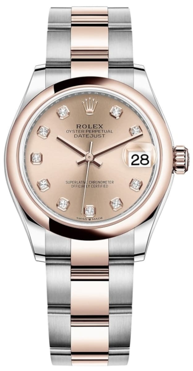 Brand New Rolex Datejust 31 Steel and 18kt Everose Gold Rose Diamond Dial Women’s Luxury Watch Model M278241-0023. Polished 18kt Everose Gold and Stainless Steel. case with 18kt Everose Gold and Stainless Steel Oyster Style Bracelet. watch band. Crownclasp clasp. Fixed-Domed bezel. Dial description: Polished Rose Gold Hands With Diamond Hour Markers and the Date Displayed on a Rose Dial. dial. Automatic – Chronometer movement. Powered by Rolex Calibre 2236 engine with 55 hours power reserve. Watch functions: Date, Power Reserve, Hour, Minute, Second. Screw in crown. Scratch Resistant Sapphire crystal. Round case shape. Case size: 31mm. Solid case back. 100 Meters – 330 Feet water resistant.