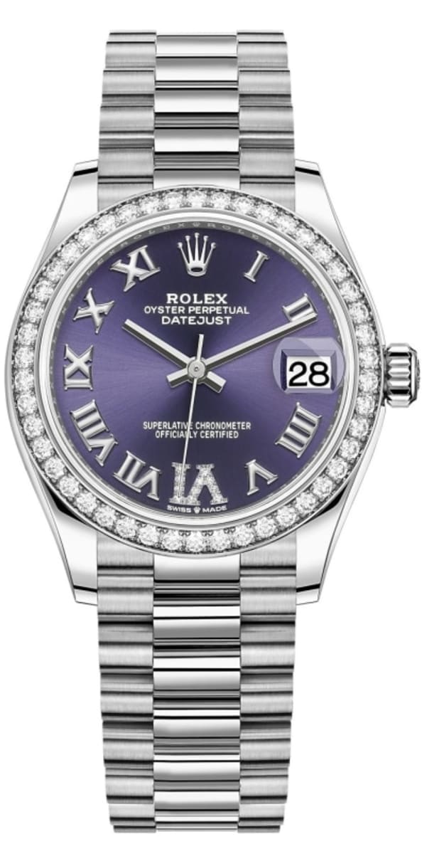 Brand New Rolex Datejust 31 White Gold Aubergine Diamond Pave Roman Dial Diamond Bezel Women’s Luxury Watch Model M278289RBR-0019. Polished 18kt White Gold case with 18kt White Gold President Style Bracelet. watch band. Crownclasp clasp. Fixed- Diamond Set bezel. Dial description: Polished 18kt White Gold Hands and Roman Numeral Hour Markers and a Diamond Pave VI With the Date at 3 o’clock on a Purple Dial. dial. Automatic movement. Powered by Rolex Calibre 2236 engine with 55 hours power reserve. Watch functions: Date, Power Reserve, Hour, Minute, Second. Screw Down crown. Scratch Resistant Sapphire crystal. Round case shape. Case size: 31mm. Solid case back. 100 Meters – 330 Feet water resistant.