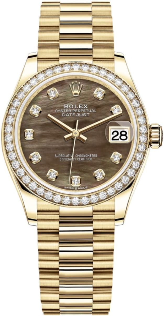 Brand New Rolex Datejust 31 Black Mother-of-Pearl Diamond Dial Diamond Bezel Women’s Luxury Watch Model M278288RBR-0032. 18kt case with 18kt President Style Bracelet. watch band. Crownclasp clasp. Fixed- Diamond Set bezel. Dial description: Polished Hands and Diamond Hour Markers With the Date Displayed at 3 o’clock on a Black Mother-of-Pearl Dial. dial. Automatic – Chronometer movement. Powered by Rolex Calibre 2236 engine with 55 hours power reserve. Watch functions: Date, Power Reserve, Hour, Minute, Second. Screw in crown. Scratch Resistant Sapphire crystal. Round case shape. Case size: 31mm. Solid case back. 100 Meters – 330 Feet water resistant.