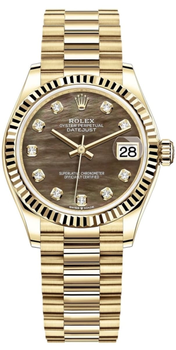 Brand New Rolex Datejust 31 Black Mother-of-Pearl Diamond Dial Women’s Luxury Watch Model M278278-0038. Polished 18kt . case with 18kt President Style Bracelet. watch band. Crownclasp clasp. Fixed-Fluted bezel. Dial description: Polished Hands and Diamond Hour Markers With the Date Displayed on a Black Mother-of-Pearl Dial. dial. Automatic – Chronometer movement. Powered by Rolex Calibre 2236 engine with 55 hours power reserve. Watch functions: Date, Power Reserve, Hour, Minute, Second. Screw in crown. Scratch Resistant Sapphire crystal. Round case shape. Case size: 31mm. Solid case back. 100 Meters – 330 Feet water resistant.