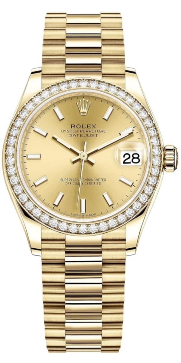 Brand New Rolex Datejust 31 Champagne Dial Diamond Bezel Women’s Luxury Watch Model M278288RBR-0022. 18kt case with 18kt President Style Bracelet. watch band. Crownclasp clasp. Fixed- Diamond Set bezel. Dial description: Luminous Stick Hour Markers and Polished Hands With the Date Displayed at 3 on a Champagne Dial. dial. Automatic – Chronometer movement. Powered by Rolex Calibre 2236 engine with 55 hours power reserve. Watch functions: Date, Power Reserve, Hour, Minute, Second. Screw in crown. Scratch Resistant Sapphire crystal. Round case shape. Case size: 31mm. Solid case back. 100 Meters – 330 Feet water resistant.