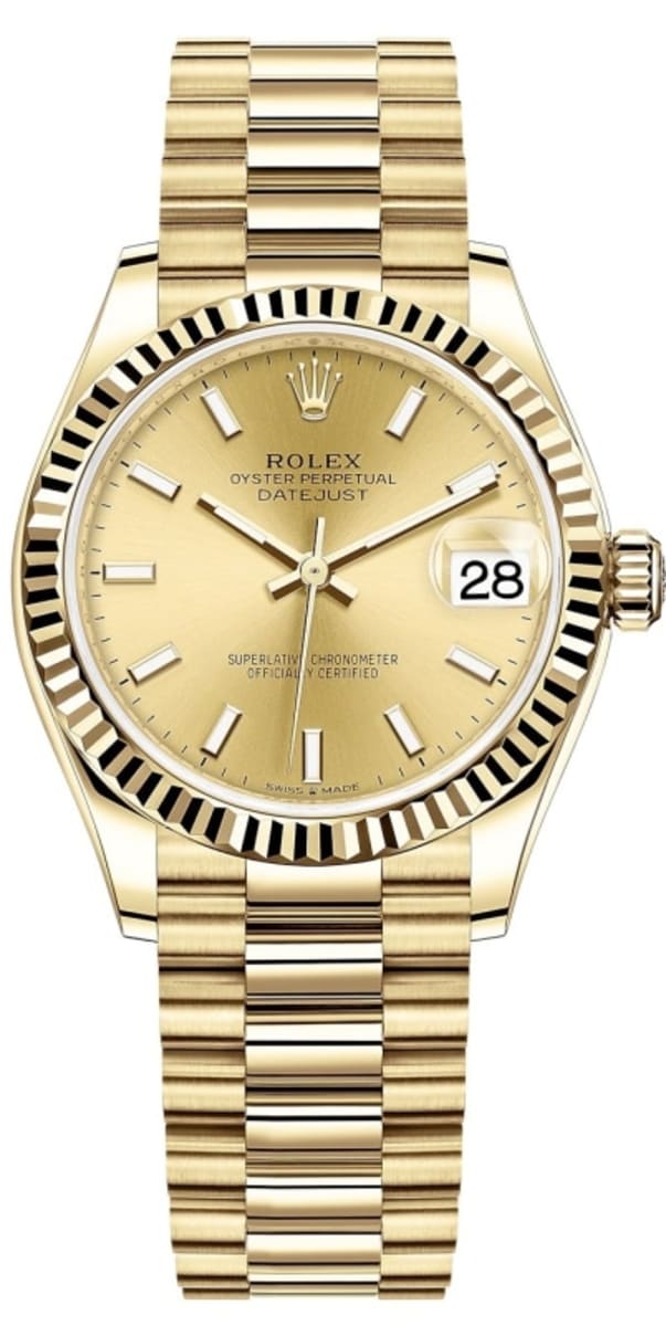 Brand New Rolex Datejust 31 Champagne Dial Women’s Luxury Watch Model M278278-0040. Polished 18kt . case with 18kt President Style Bracelet. watch band. Crownclasp clasp. Fixed-Fluted bezel. Dial description: Luminous Stick Hour Markers and Hands With the Date Displayed on a Champagne Dial. dial. Automatic – Chronometer movement. Powered by Rolex Calibre 2236 engine with 55 hours power reserve. Watch functions: Date, Power Reserve, Hour, Minute, Second. Screw in crown. Scratch Resistant Sapphire crystal. Round case shape. Case size: 31mm. Solid case back. 100 Meters – 330 Feet water resistant.