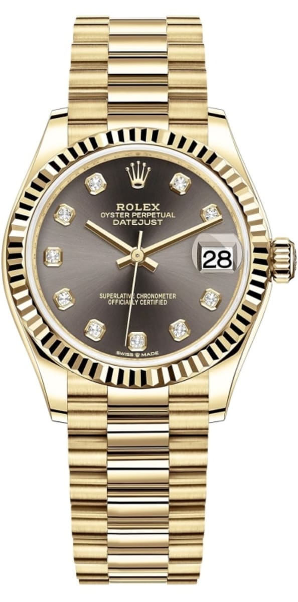 Brand New Rolex Datejust 31 Dark Grey Diamond Dial Women’s Luxury Watch Model M278278-0036. Polished 18kt . case with 18kt President Style Bracelet. watch band. Crownclasp clasp. Fixed-Fluted bezel. Dial description: Polished Hands and Diamond Hour Markers With the Date Displayed on a Dark Grey Dial. dial. Automatic – Chronometer movement. Powered by Rolex Calibre 2236 engine with 55 hours power reserve. Watch functions: Date, Power Reserve, Hour, Minute, Second. Screw in crown. Scratch Resistant Sapphire crystal. Round case shape. Case size: 31mm. Solid case back. 100 Meters – 330 Feet water resistant.