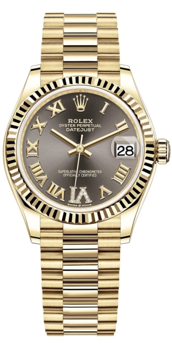 Rolex Datejust 31 Yellow Gold Dark Grey Pave Roman Diamond Dial Women’s Watch M278278-0032 31mm