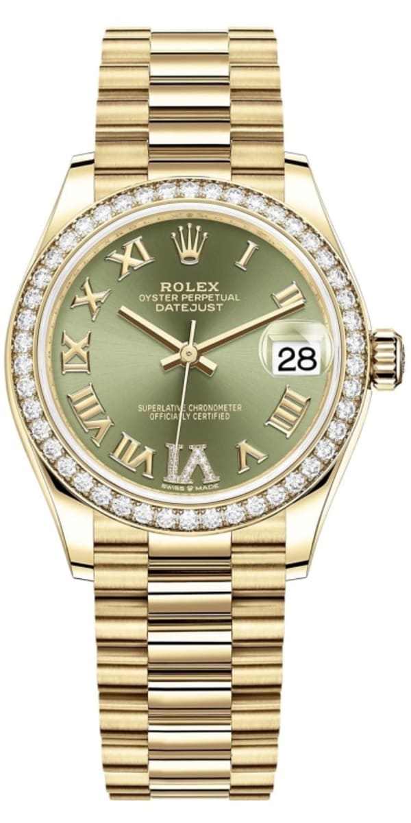 Brand New Rolex Datejust 31 Olive Green Pave Roman Diamond Dial Diamond Bezel Women’s Luxury Watch Model M278288RBR-0024. 18kt case with 18kt President Style Bracelet. watch band. Crownclasp clasp. Fixed- Diamond Set bezel. Dial description: Polished Hands and Roman Numeral Hour Markers With a Diamond Pave VI and the Date Displayed at 3 on an Olive Green Dial. dial. Automatic – Chronometer movement. Powered by Rolex Calibre 2236 engine with 55 hours power reserve. Watch functions: Date, Power Reserve, Hour, Minute, Second. Screw in crown. Scratch Resistant Sapphire crystal. Round case shape. Case size: 31mm. Solid case back. 100 Meters – 330 Feet water resistant.