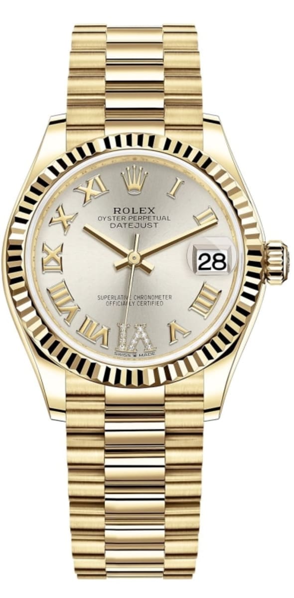 Brand New Rolex Datejust 31 Silver Pave Roman Diamond Dial Women’s Luxury Watch Model M278278-0028. Polished 18kt . case with 18kt President Style Bracelet. watch band. Crownclasp clasp. Fixed-Fluted bezel. Dial description: Polished Hands and Roman Numeral Hour Markers With a Diamond Pave VI and the Date Displayed on an Silver Dial. dial. Automatic – Chronometer movement. Powered by Rolex Calibre 2236 engine with 55 hours power reserve. Watch functions: Date, Power Reserve, Hour, Minute, Second. Screw in crown. Scratch Resistant Sapphire crystal. Round case shape. Case size: 31mm. Solid case back. 100 Meters – 330 Feet water resistant.