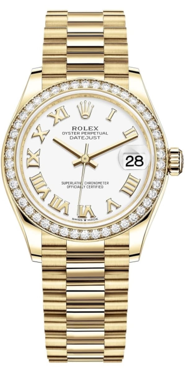 Rolex Datejust 31 Yellow Gold White Roman Dial Diamond Bezel Women’s Watch M278288RBR-0009 31mm