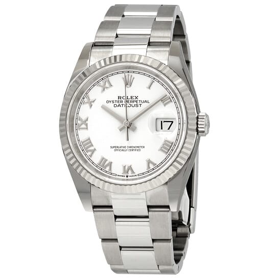 Stainless steel case with a stainless steel Rolex oyster bracelet. Fixed fluted 18kt white gold bezel. White dial with silver-tone hands and Roman numeral hour markers. Minute markers around the outer rim. Dial Type: Analog. Date display at the 3 o’clock position. Rolex calibre 3235 automatic movement, based upon Rolex 3035, containing 31 Jewels, bitting at 28800 vph, and has a power reserve of approximately 70 hours. Scratch resistant sapphire crystal. Screw down crown. Solid case back. Round case shape. Case size: 36 mm. Oysterlock clasp. Water resistant at 100 meters / 330 feet. Functions: date, hour, minute, second. Datejust 36 Series. Luxury watch style. Watch label: Swiss Made. Rolex Datejust 36 Automatic White Dial Ladies Oyster Watch 126234WRO.