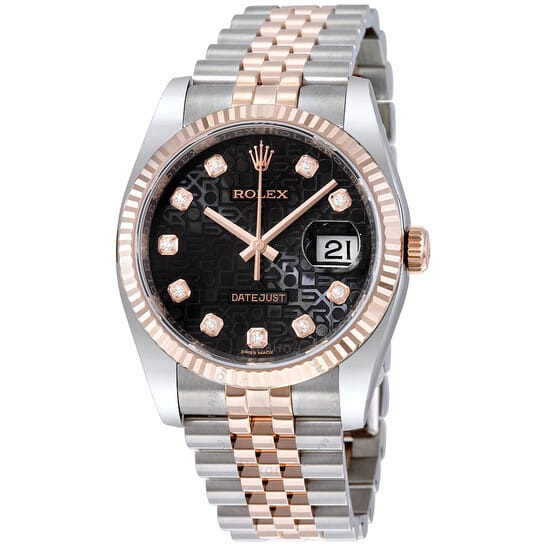 Stainless steel case with a stainless steel Rolex jubilee bracelet with 18kt everose gold center links. Fixed fluted 18kt everose gold bezel. Black jubilee dial with rose gold-tone hands and diamond hour markers. Dial Type: Analog. Date display at the 3 o’clock position. Rolex calibre 3135 automatic movement with a 50-hour power reserve. Scratch resistant sapphire crystal. Screw down crown. Solid case back. Case size: 36 mm. Round case shape. Concealed crown clasp. Water resistant at 100 meters / 330 feet. Functions: date, hour, minute, second. Luxury watch style. Watch label: Swiss Made. Rolex Datejust 36 Black Jubilee Dial Stainless Steel and 18K Everose Gold Rolex Jubilee Automatic Men’s Watch 116231BKJDJ.