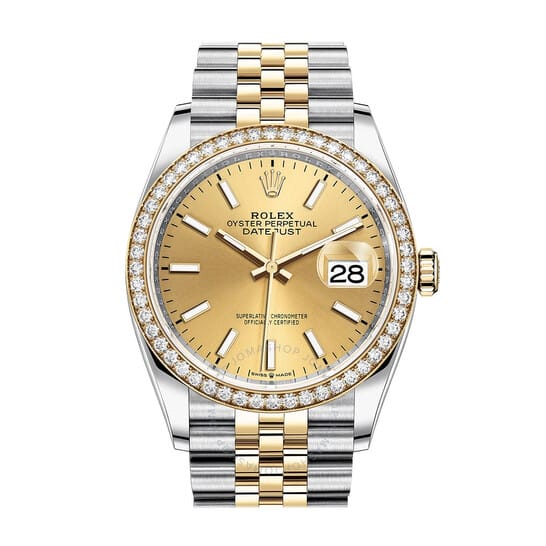 Stainless steel and 18kt yellow gold case with a stainless steel and 18kt yellow gold rolex jubilee bracelet. Fixed-diamond set bezel. Champagne dial with yellow gold hands and index hour markers. Dial Type: Analog. Date display at the 3 o’clock position. Rolex Calibre 3235 automatic movement with a 70-hour power reserve. Scratch resistant sapphire crystal. Screw down crown. Solid case back. Round case shape. Case size: 36 mm. Water resistant at 100 meters / 330 feet. Functions: date, hour, minute, second. Luxury watch style. Watch label: Swiss Made. Rolex Datejust 36 Champagne Dial Men’s Steel and 18kt Jubilee Watch 126283CSJ.