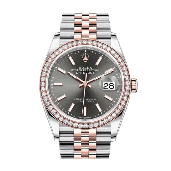 Stainless steel and 18k everose gold case with a stainless steel and 18k everose gold rolex jubilee bracelet. Fixed everose gold diamond set bezel. Dark rhodium dial with everose gold hands and index hour markers. Dial Type: Analog. Date display at the 3 o’clock position. Rolex Calibre 3235 automatic movement with a 70-hour power reserve. Scratch resistant sapphire crystal. Screw down crown. Solid case back. Round case shape. Case size: 36 mm. Water resistant at 100 meters / 330 feet. Functions: date, hour, minute, second. Luxury watch style. Watch label: Swiss Made. Rolex Datejust 36 Dark Rhodium Dial Men’s Steel and 18k Everose Gold Jubilee Watch 126281RSJ.