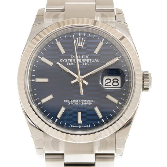 Stainless steel & 18k white gold case with a stainless steel oyster bracelet. Fluted 18k white gold bezel. Bright blue motif dial with silver-tone hands and index hour markers. Dial Type: Analog. Luminescent hands and markers. Date display at the 3 o’clock position. Rolex Calibre 3235 Automatic movement, based upon Rolex 3035, containing 31 Jewels, bitting at 28800 vph, and has a power reserve of approximately 70 hours. Scratch resistant sapphire crystal. Screw down crown. Screw down case back. Round case shape, case size: 36 mm. Folding with 5 mm comfort extension link clasp. Water resistant at 100 meters / 330 feet. Functions: date, hour, minute, second, chronometer. Datejust 36 Series. Luxury watch style. Watch label: Swiss Made. Rolex Datejust 36 Quartz Chronometer Watch 126234BLFSO.