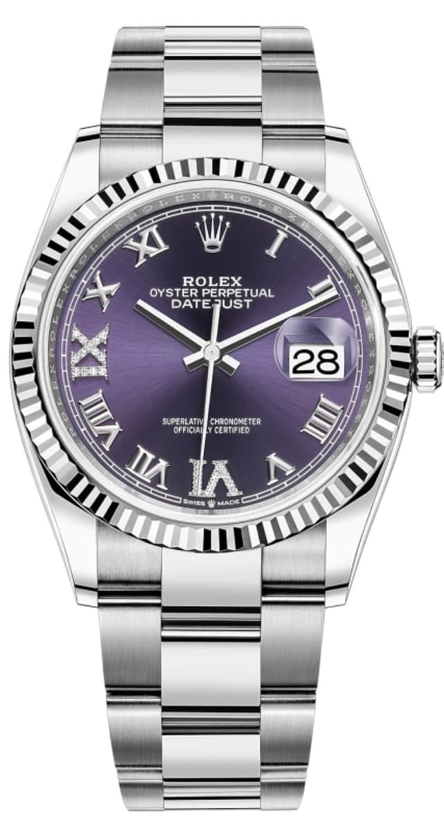 Brand New Rolex Datejust 36 Stainless Steel Aubergine Diamond Pave Roman Dial Women’s Luxury Watch Model M126234-0022. Polished White Gold and Stainless Steel case with White Gold and Stainless Steel Oyster Style Bracelet watch band. Oysterclasp clasp. Fixed-Fluted 18kt White Gold bezel. Dial description: Polished 18kt White Gold Hands and Roman Numeral Hour Markers. Pave Diamond set VI and IX Hour Markers and the Date Displayed at 3, on an Aubergine Dial. dial. Automatic – Chronometer movement. Powered by Rolex Calibre 3235 engine with 70 hours power reserve. Watch functions: Date, Power Reserve, Hour, Minute, Second. Screw Down crown. Scratch Resistant Sapphire crystal. Round case shape. Case size: 36mm. Case thickness: 11.6mm. Solid case back. 100 Meters – 330 Feet water resistant.