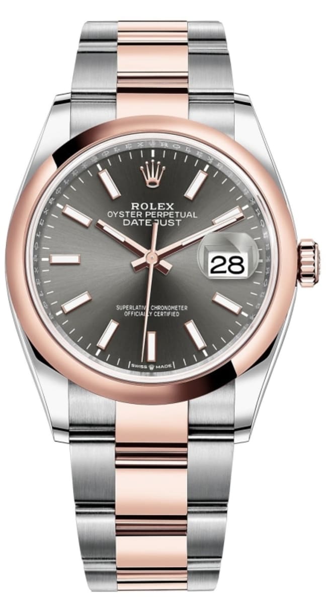 Brand New Rolex Datejust 36 Steel & Everose Gold Slate Dial Women’s Luxury Watch Model M126201-0014. Polished 18kt Rose Gold and Stainless Steel. case with Stainless Steel and 18kt Rose Gold Rolex Oyster Style Bracelet watch band. Oysterclasp clasp. Fixed-Domed bezel. Dial description: Polished Everose Gold Hands with Stick Hour Markers, and the Date Displayed at 3, on a Slate Dial. dial. Automatic – Chronometer movement. Powered by Rolex Calibre 3235 engine with 70 hours power reserve. Watch functions: Date, Power Reserve, Hour, Minute, Second. Screw in crown. Scratch Resistant Sapphire crystal. Round case shape. Case size: 36mm. Solid case back. 100 Meters – 330 Feet water resistant.