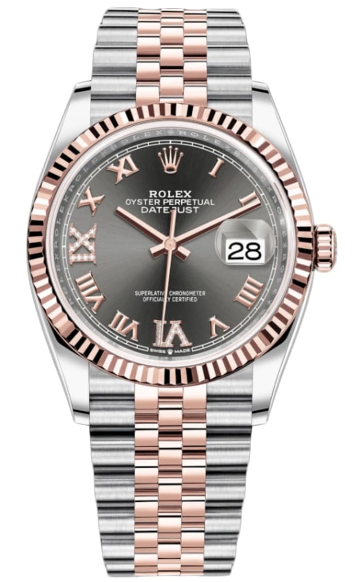 Brand New Rolex Datejust 36 Steel & Everose Gold Slate Diamond Pave Roman Dial Women’s Luxury Watch Model M126231-0023. 18kt Rose Gold and Stainless Steel case with 18kt Rose Gold and Stainless Steel Jubilee Style Bracelet. watch band. Oysterclasp clasp. Fixed-Fluted bezel. Dial description: Luminescent Rose Gold Hands and Roman Numeral Hour Markers With a Diamond Pave VI and IX and the Date Displayed at 3, on a Slate dial. Automatic – Chronometer movement. Powered by Rolex Calibre 3235 engine with 70 hours power reserve. Watch functions: Date, Power Reserve, Hour, Minute, Second. Screw in crown. Scratch Resistant Sapphire crystal. Round case shape. Case size: 36mm. Solid case back. 100 Meters – 330 Feet water resistant.