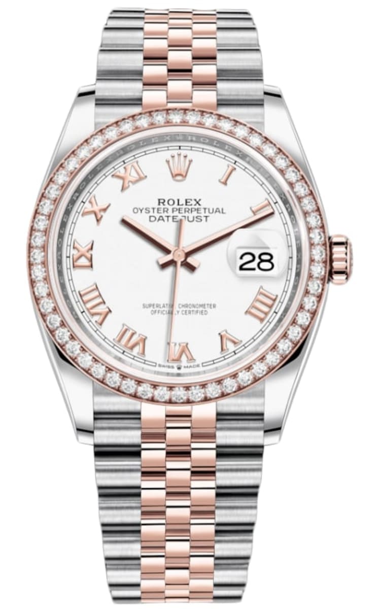 Rolex Datejust 36 Steel & Everose Gold White Roman Dial Diamond Bezel Women’s Watch M126281RBR-0003 36mm