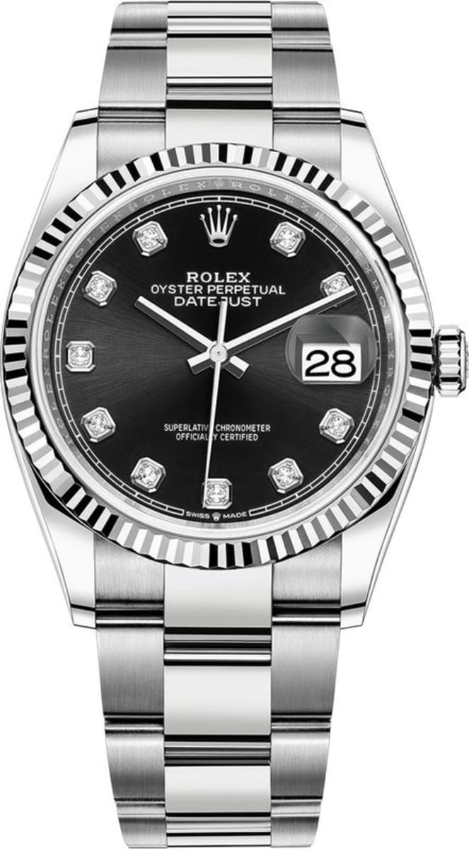 Brand New Rolex Datejust 36 Steel & White Gold Black Diamond Dial Women’s Luxury Watch Model M126234-0028. Polished White Gold and Stainless Steel case with White Gold and Stainless Steel Oyster Style Bracelet watch band. Oysterclasp clasp. Fixed-Fluted 18kt White Gold bezel. Dial description: Polished 18kt White Gold Hands and Diamond Hour Markers and the Date Displayed at 3, on a Black Dial. dial. Automatic – Chronometer movement. Powered by Rolex Calibre 3235 engine with 70 hours power reserve. Watch functions: Date, Power Reserve, Hour, Minute, Second. Screw Down crown. Scratch Resistant Sapphire crystal. Round case shape. Case size: 36mm. Solid case back. 100 Meters – 330 Feet water resistant. Also known as model: 126234 Black Diamond Oyster.