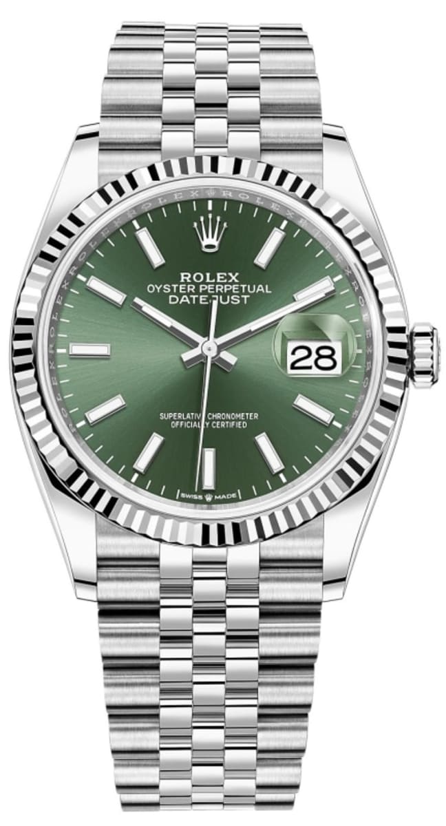 Brand New Rolex Datejust 36 Steel & White Gold Mint Green Dial Women’s Luxury Watch Model M126234-0051. Polished White Gold and Stainless Steel case with White Gold and Stainless Steel Jubilee Style Bracelet. watch band. Oysterclasp clasp. Fixed-Fluted bezel. Dial description: Luminescent White Gold Hands and Stick Hour Markers, With Minute Markers Around the Outer Rim on a Mint Green dial. Automatic Self Winding movement. Powered by Rolex Calibre 3235 engine with 70 hours power reserve. Watch functions: Date, Hour, Minute, Second. Screw Down crown. Scratch Resistant Sapphire crystal. Round case shape. Case size: 36mm. Solid case back. 100 Meters – 330 Feet water resistant.