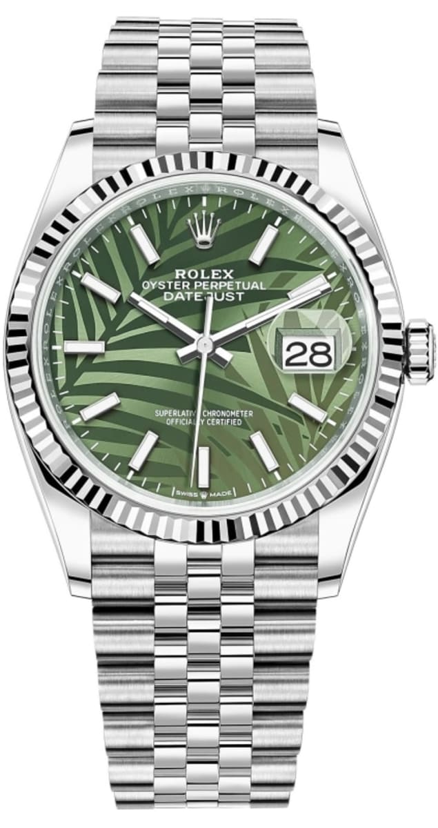 Rolex Datejust 36 Steel & White Gold Olive Green Palm-Motif Dial Women’s Watch M126234-0047 36mm