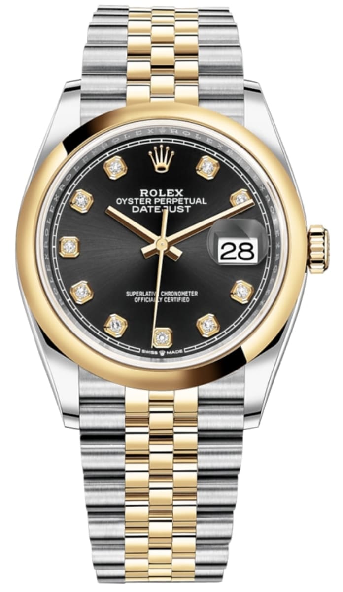 Brand New Rolex Datejust 36 Steel & Black Diamond Dial Women’s Luxury Watch Model M126203-0021. Polished 18kt and Stainless Steel case with Stainless Steel and 18kt Jubilee Style Bracelet. watch band. Oysterclasp clasp. Fixed-Domed bezel. Dial description: Polished Hands and Diamond Hour Markers, With the Date Displayed at 3, on a Black Dial. dial. Automatic Self Winding movement. Powered by Rolex Calibre 3235 engine with 70 hours power reserve. Watch functions: Date, Power Reserve, Hour, Minute, Second. Screw in crown. Scratch Resistant Sapphire crystal. Round case shape. Case size: 36mm. Solid case back. 100 Meters – 330 Feet water resistant.
