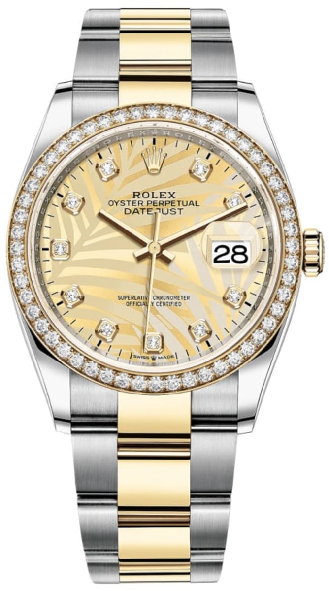 Brand New Rolex Datejust 36 & Diamonds Golden Palm-Motif Diamond Dial Women’s Luxury Watch Model M126283RBR-0030. Stainless Steel Case and 18kt Diamond-set Bezel. case with Stainless Steel and 18kt Oyster Style Bracelet. watch band. Oysterclasp clasp. Fixed- Diamond Set bezel. Dial description: Luminescent Hands and Diamond Hour Markers, With the Date Displayed at 3, on a Golden Palm-Motif Dial. dial. Automatic – Chronometer movement. Powered by Rolex Calibre 3235 engine with 70 hours power reserve. Watch functions: Date, Power Reserve, Hour, Minute, Second. Screw in crown. Scratch Resistant Sapphire crystal. Round case shape. Case size: 36mm. Solid case back. 100 Meters – 330 Feet water resistant.