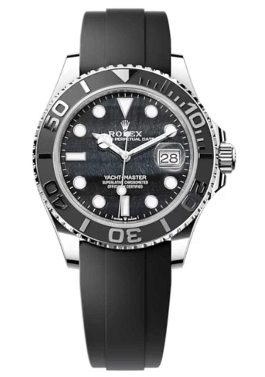 Brand New Rolex Yacht-Master 42 Falcon’s Eye Dial 18kt White Gold Oysterflex Men’s Luxury Watch Model M226659-0004. Polished 18kt White Gold case with Black Oysterflex Band. strap. Oysterclasp clasp. Bi-directional Rotating bezel. Dial description: Luminescent White Gold Hands with Circle and Index Hour Markers with the Date Displayed at 3, on a Falcon’s Eye Dial. dial. Automatic – Chronometer movement. Calendar: Date at 3 o’clock. Chronograph sub-dials display: Date. Powered by Rolex Calibre 3235 engine with 70 hours power reserve. Watch functions: Date, Power Reserve, Hour, Minute, Second. Screw in crown. Scratch Resistant Sapphire crystal. Round case shape. Case size: 42mm. Solid case back. 100 Meters – 330 Feet water resistant.