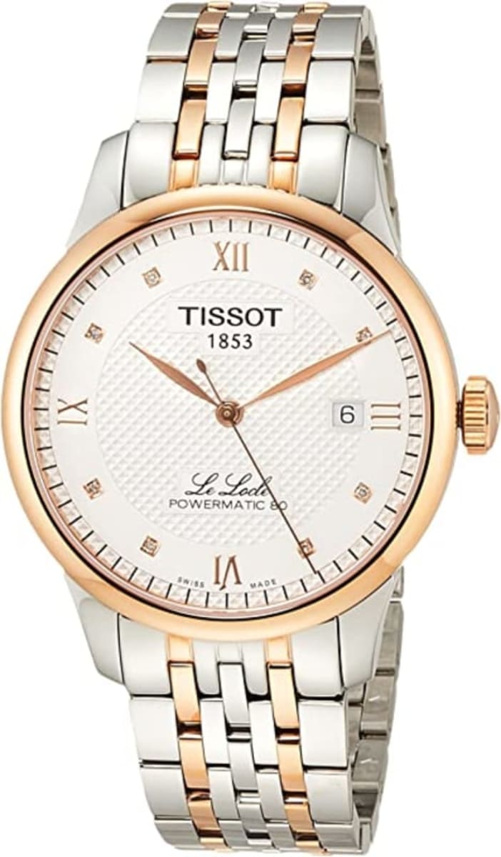 Brand New Tissot Le Locle Powermatic 80 Silver Diamond Dial Two-Tone Men’s Dress Watch Model T006.407.22.036.00. Rose Gold PVD Stainless Steel case with Rose Gold PVD and Stainless Steel watch band. Deployment with Push Button clasp. Dial description: Rose Gold Hands and Diamond/Roman Numeral Hour Markers With Minute Markers Around the Outer rim and a Date Display, on a Silver Dial. dial. Automatic movement. Powered by Tissot Caliber Powermatic 80.111 engine with 80 hours power reserve. Watch functions: Date, Power Reserve, Hour, Minute, Second. Scratch Resistant Sapphire crystal. Round case shape. Case size: 39.3mm. Case thickness: 9.75mm. Transparent case back (for illustration purposes only). 30 Meters – 100 Feet water resistant. Also known as model: T0064072203600.