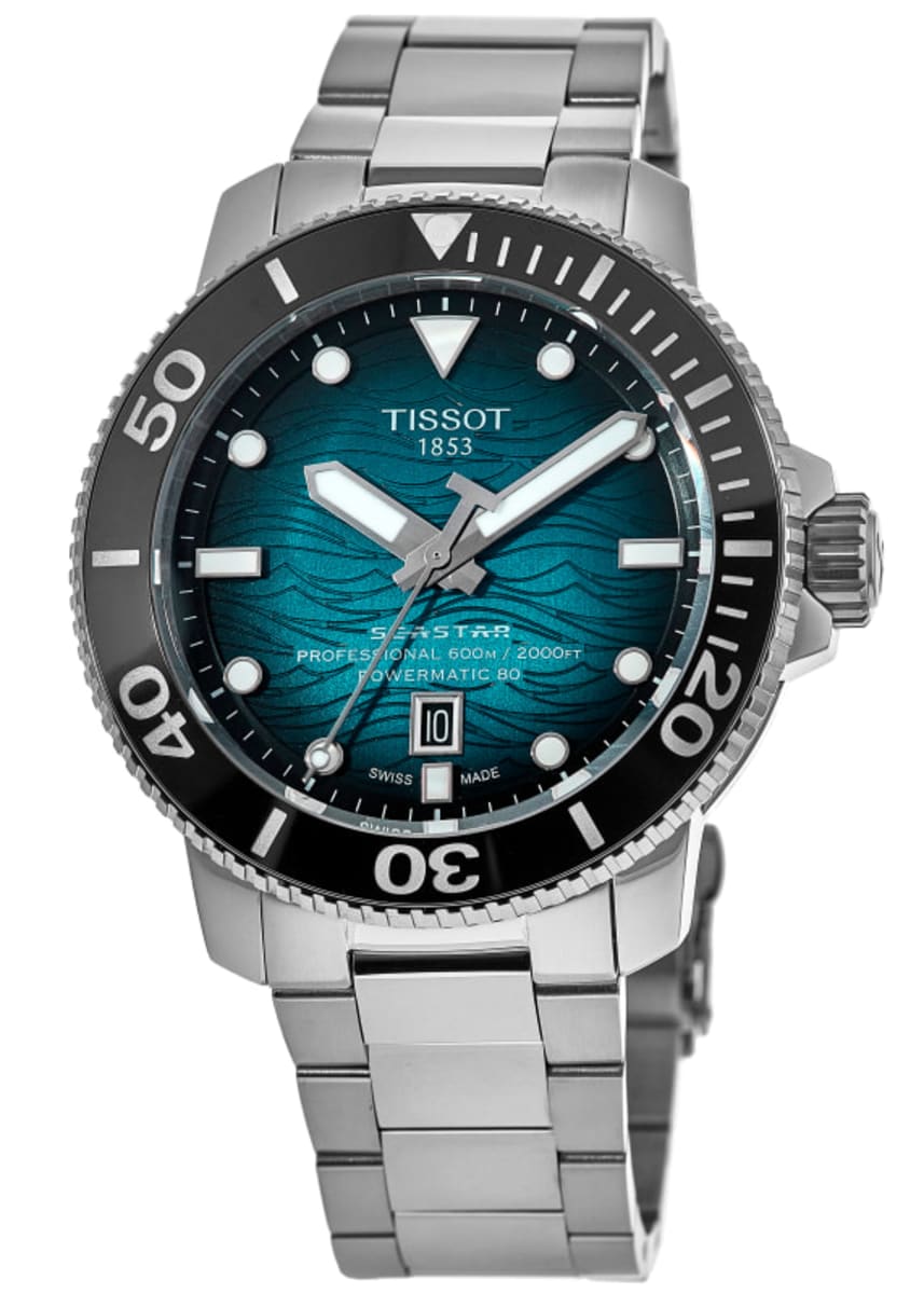 Brand New Tissot Seastar 2000 Professional Automatic Blue Gradient Dial Steel Men’s Watch Model T120.607.11.041.00. Stainless Steel case with Stainless Steel watch band. Deployment with Push Button clasp. Dial description: Silver tone luminous hands and Index/Circle hour markers with minute markers around the outer rim on a Blue dial. Automatic movement. Powered by Tissot Caliber Powermatic 80.111 engine with 80 hours power reserve. Watch functions: Date, Power Reserve, Hour, Minute, Second. Screw Down crown. Scratch Resistant Sapphire crystal. Round case shape. Case size: 46mm. Case thickness: 16.3mm. Transparent case back (for illustration purposes only). 600 Meters – 2000 Feet water resistant. Don’t be afraid to take this watch out for a swim. The Tissot Seastar 2000 Professional Automatic watch is a classic take on a diver’s watch. The ocean-inspired face is a deep-sea blue with a wave motif. Its metal band looks at home on the beach or in the office. Rated at 300m, the watch is ready for an afternoon in the water. Also known as model: T1206071104100.