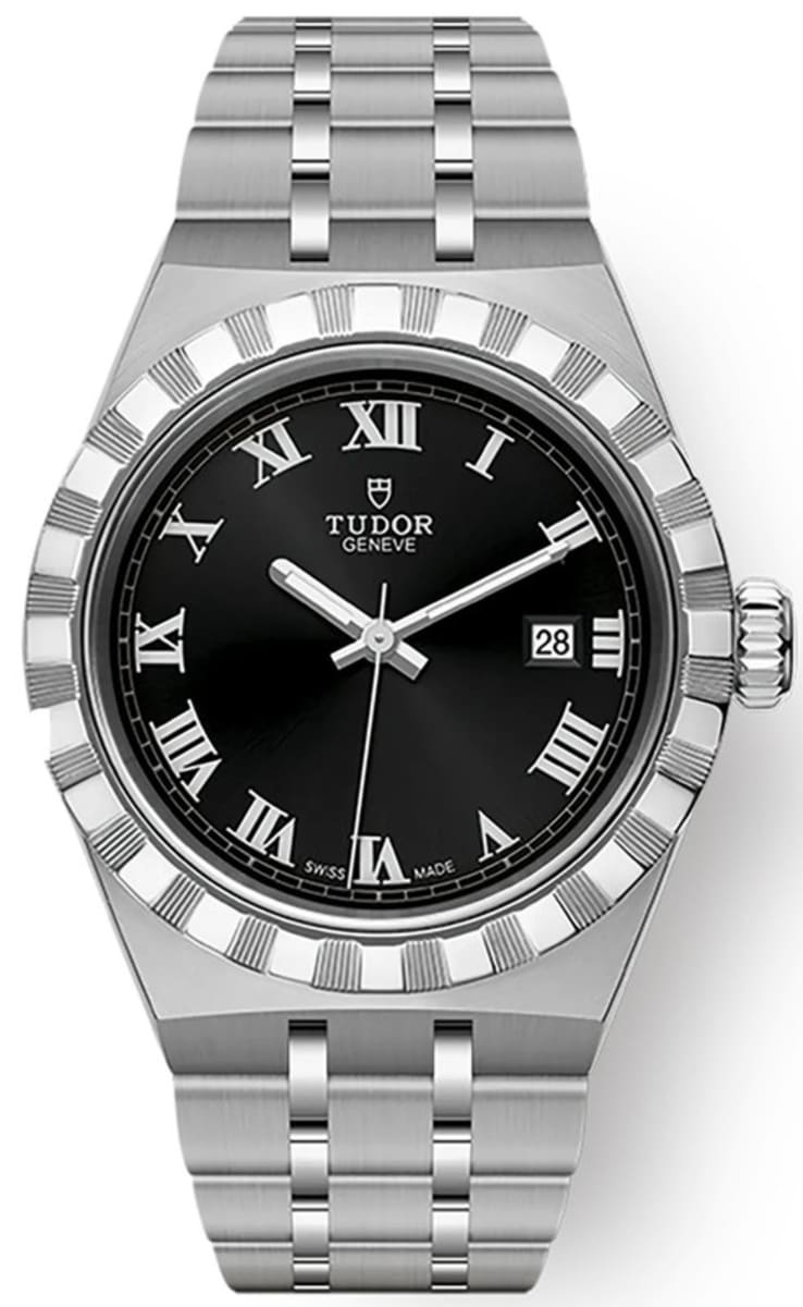 Brand New Tudor Royal Black Dial Stainless Steel Unisex Watch Model M28300-0003. Stainless Steel case with Stainless Steel watch band. Folding clasp. Fluted bezel. Dial description: Silver tone hands and Roman Numeral Hour markers with minute markers around the outer rim on a Black dial. Automatic movement. Powered by Tudor Calibre T201 engine with 38 hours power reserve. Watch functions: Date, Power Reserve, Hour, Minute, Second. Screw Down crown. Scratch Resistant Sapphire crystal. Round case shape. Case size: 28mm. Solid case back. 100 Meters – 330 Feet water resistant. Also known as model: M283000003.